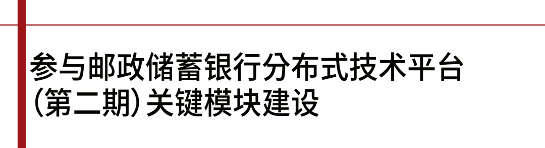 今年4月,邮储银行新一代分布式核心技术平台(一期)成功投产上线,神州信息作为新核心建设重要参与者,在技术平台一期建设中承担产品装配和差异化定价两个关键功能的咨询、设计和需求编制等工作。一期项目上线,为邮储银行后续新核心建设夯实了基础。