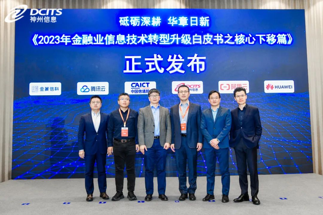 在本次大会上, 神州信息联合中国信通院、阿里云、腾讯云、华为、金篆信科等单位共同发布了《砥砺深耕,华章日新—2023年金融业信息技术转型升级白皮书之核心下移篇》(以下简称“白皮书”),神州信息副总裁马洪杰(上图右三)、中国信通院副总工程师石友康(上图左三)、阿里云新金融事业部副总经理 宋勇(上图右二)、腾讯金融云副总经理王丰辉(上图左二)、华为数字金融军团分布式新核心业务总经理韩满(上图右一)、金篆信科副总经理张校逸(上图左一)等嘉宾共同出席发布仪式,神州信息金融技术部总经理张劲(下图)作为代表对白皮书进行了解读。